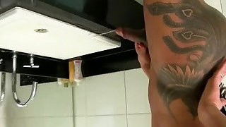 Muscular shemale gets naked and urinates