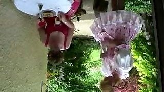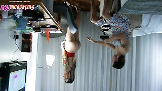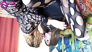 Blonde on brunette SheLesbians playing with a camera and their shelesbian dicks while kissing each other and getting rock-hard and