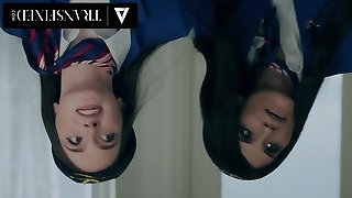 Lovely Busty Teen Stewardess Enjoys Gonzo Orgy With Her Charming Brunette Transgender Princess Colleague