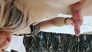 Blonde tranny jacks her monster cock